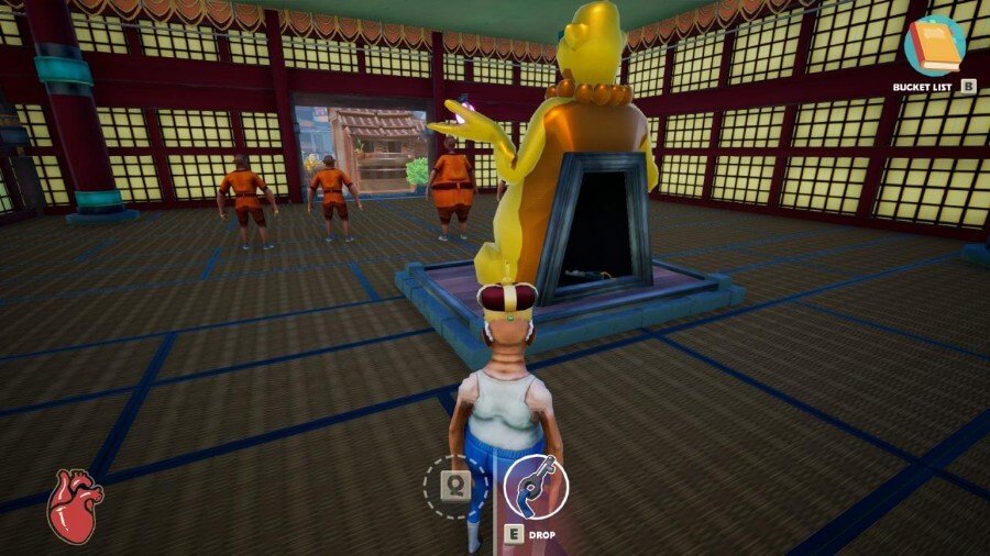 주변을 돌아 다니며 작업과 작업을 수행하는 사람들의 완전한 커뮤니티가 있습니다. 대부분은 평화롭지만 가까이 다가가면 화를 내는 캐릭터도 있다. 당신은 달릴 수 있지만, 그들은 당신을 심하게 다치게 하거나 죽일 가능성이 높습니다. 그들이 공격하는 것을 피하려면 앞마당에 있는 징 근처에 있는 여승에게서 얻을 수 있는 선 마스터 모자가 필요합니다.