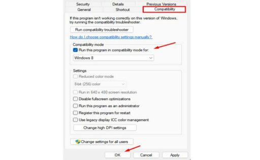 - 다음 상자를 선택하세요. “이 프로그램을 호환 모드로 실행하세요.” 다음과 같은 이전 버전의 Windows를 선택하세요. 윈도우 7 또는 윈도우 8.