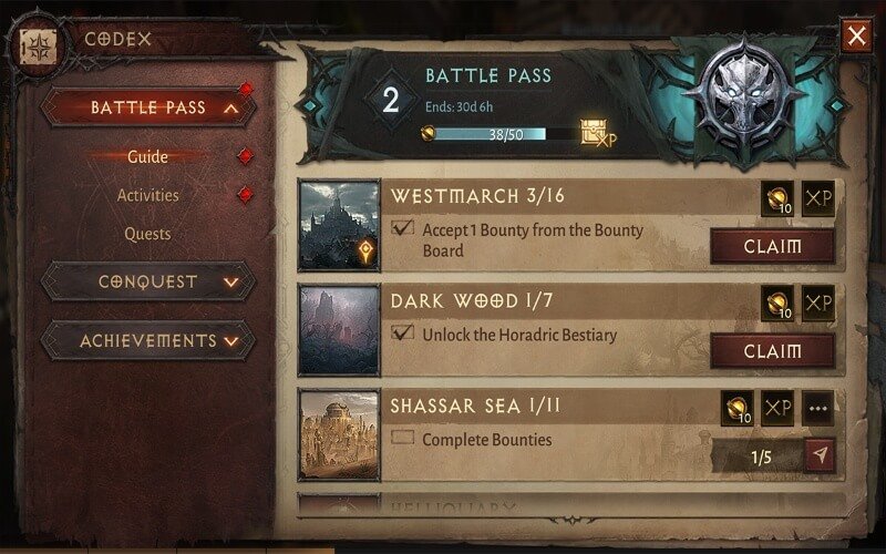 Diablo Immortal의 배틀 패스는 게임에서 더 빨리 레벨을 올리기 위한 핵심입니다. 각 레벨은 거의 완전한 수준의 XP를 보장합니다. 현상금, 엘더 리프트, 던전을 완료하고 적을 죽이면 모두 새로운 배틀 패스 레벨에 도달하기 위한 전투 점수를 얻는 데 기여합니다. 배틀 패스에는 무료 및 유료 버전이 있습니다. 지불하면 추가 혜택이 있지만, 최소한 무료 버전의 잠금을 해제하고 싶습니다.. 활동 섹션에는 획득할 XP의 두 배인 “추천”으로 표시된 특정 작업이 있습니다. 레벨 30 부근의 벽에 부딪힐 때까지 배틀 패스 보상을 청구하지 마십시오. 이 시점에서 레벨을 올리려면 상당한 양의 XP가 필요하지만 배틀 패스 보상을 청구할 때 캐릭터의 현재 레벨을 기준으로 합니다. 즉, 필요한 포인트 수에 관계없이 거의 전체 수준의 XP를 받을 수 있습니다.