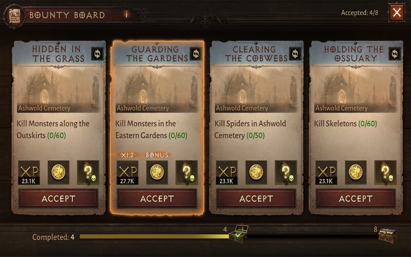 현상금 사냥은 Diablo Immortal에서 XP를 얻는 또 다른 좋은 방법입니다. 현상금 게시판은 Westmarch의 Palace Courtyard에 있습니다. 현상금은 병참장이 제공하는 미니 퀘스트이며 다음을 수행할 수 있습니다. 한 번에 4개, 하루에 8개 완료. 두 가지 유형의 현상금 중에서 선택할 수 있습니다. 파란색 테두리가 있는 오픈 월드 현상금과 녹색 테두리가 있는 던전 현상금입니다. 당신의 유일한 목적이 빨리 레벨을 올리는 것이라면, 던전 현상금이 더 많은 시간을 소비하므로 오픈 월드 옵션을 고수하십시오.. 제안된 현상금을 다시 굴려서 하루에 최대 3번까지 더 유리한 도전에 도전할 수 있습니다. 현상금은 혼자 또는 파티와 함께 완료할 수 있습니다. 현상금은 특정 유형의 적 수십 명을 죽이기 위해 특정 위치로 안내합니다. 4개의 현상금을 완료할 때마다 병참장교로부터 많은 양의 XP와 미니 퀘스트를 완료하는 동안 전투에서 얻은 XP를 얻게 됩니다.