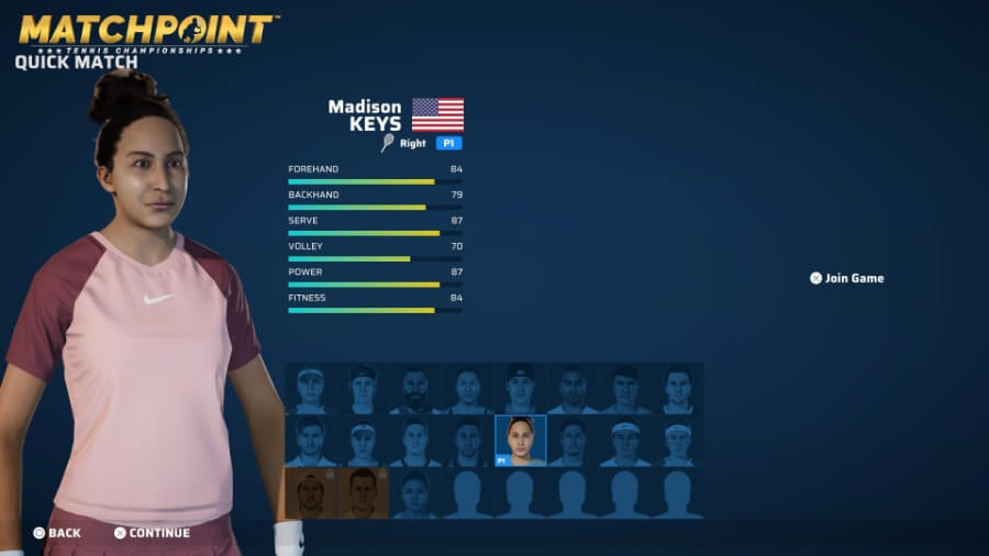 Madison Keys는 다재다능한 선수로 등장합니다. Keys는 그녀의 높은 파워(87)에 의해 도움을 받는 그녀의 서브(87)로 훌륭합니다. 포핸드(84)와 체력(84)도 좋아 코트에서 지치지 않고 빠르게 움직여야 한다. 그녀가 부족한 유일한 장소는 그녀의 백핸드(79)와 특히 그녀의 발리(70)입니다. 키를 사용하여 발리를 너무 많이 하지 말고 가능하면 백핸드보다 포핸드에 더 집중하십시오.