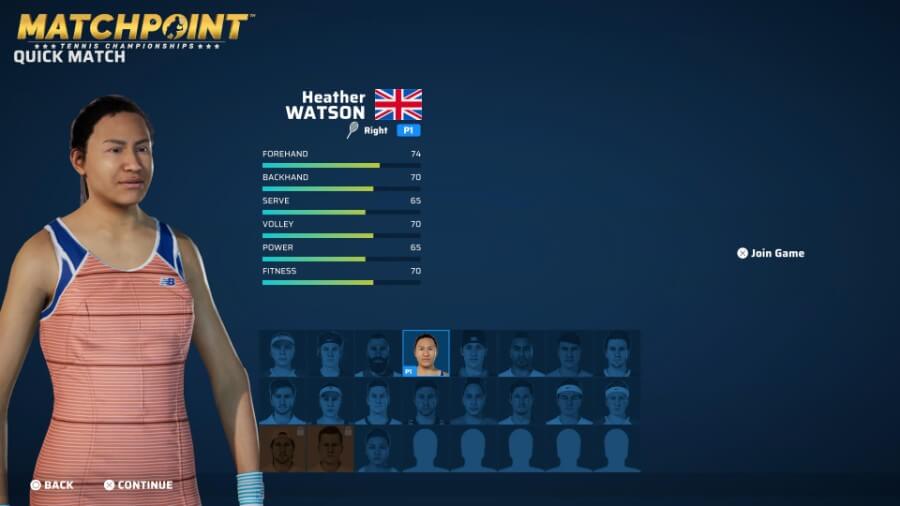헤더 왓슨은 객관적으로 게임에서 가장 낮은 평가를 받은 선수입니다. 불행히도 그녀는 65에서 74 사이의 범위에 있기 때문에 74 이상의 속성을 가지고 있지 않습니다. 긍정적인 점은 그녀의 최고 속성과 최저 속성 사이에 큰 차이가 없다는 것입니다. 그녀는 74개의 포핸드, 70개의 백핸드, 70개의 발리슛으로 볼을 잘 치는 스트라이커입니다. 그러나 그녀의 서브와 파워는 모두 65로 서브가 좋지 않고 서브와 샷 뒤에 파워가 많지 않습니다.