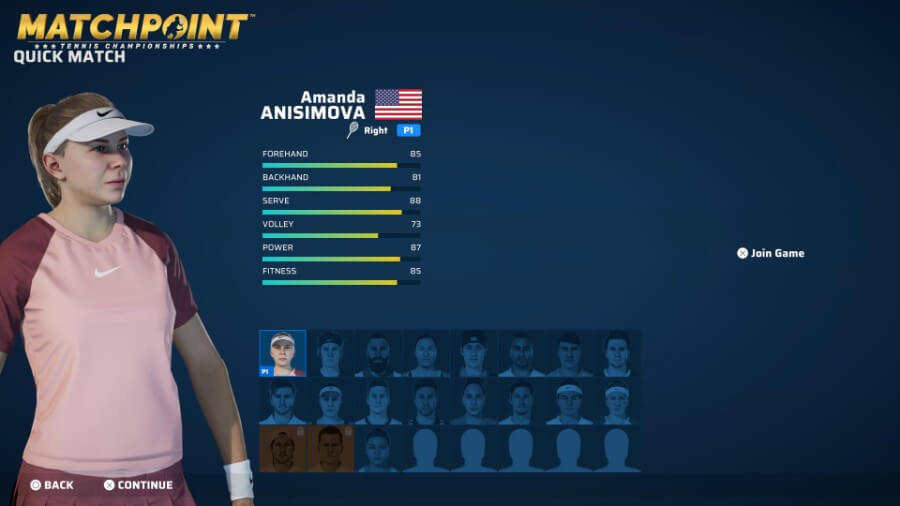 Amanda Anisimova는 게임 출시 당시 20세의 최연소 플레이어입니다. 그녀는 약속을 보여주었고 그녀의 속성은 그녀의 잠재력을 반영합니다. 그녀는 88 서브, 87 파워, 85 포핸드를 가지고 있어 강력한 서버이자 숙련된 포핸드 플레이어입니다. 그녀는 또한 85 피트니스를 가지고 있어 상당히 빠르게 움직일 수 있으며 81 백핸드를 보유하고 있습니다. 그러나 이 목록에 있는 다른 사람들과 마찬가지로 그녀는 발리 부서에서 73점으로 부족하므로 가능한 한 발리 경기를 피하십시오.