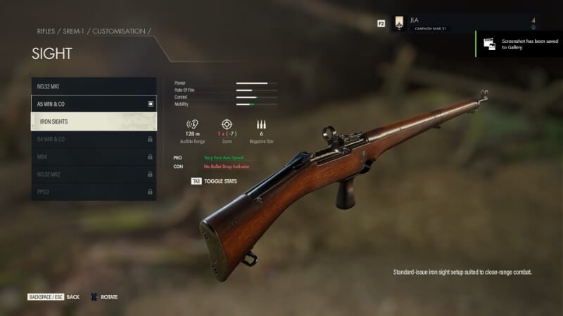 Iron Sights는 전투 중에 좋은 조준을 얻을 수 있으므로 발사 속도가 더 높은 저격 소총에 사용하는 것이 좋습니다. 또한 나치 군인 무리와 마주했을 때 유용합니다. 또한 트로피 수집가를 위해 철제 조준기를 사용하여 터진 두 개의 트로피가 있습니다. 하나는 특히 소총용입니다.