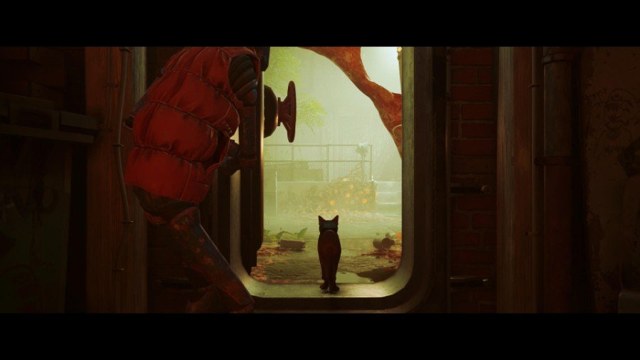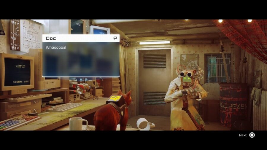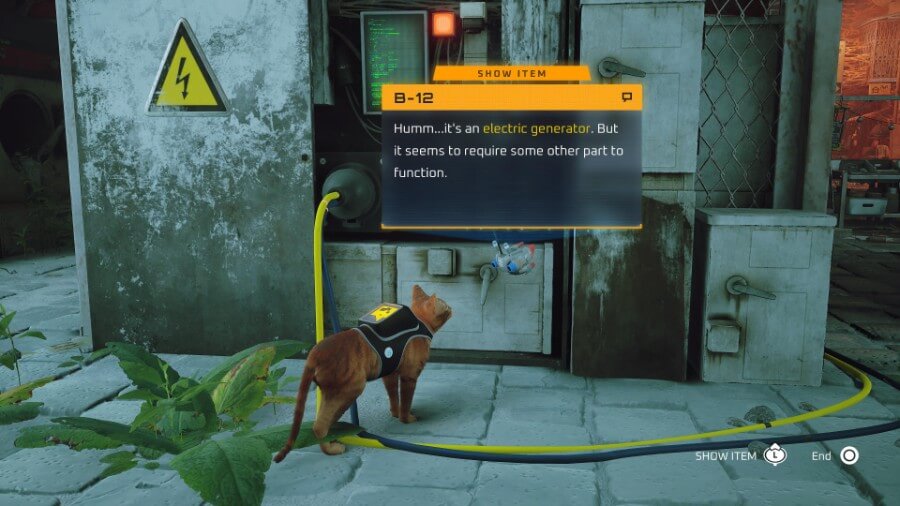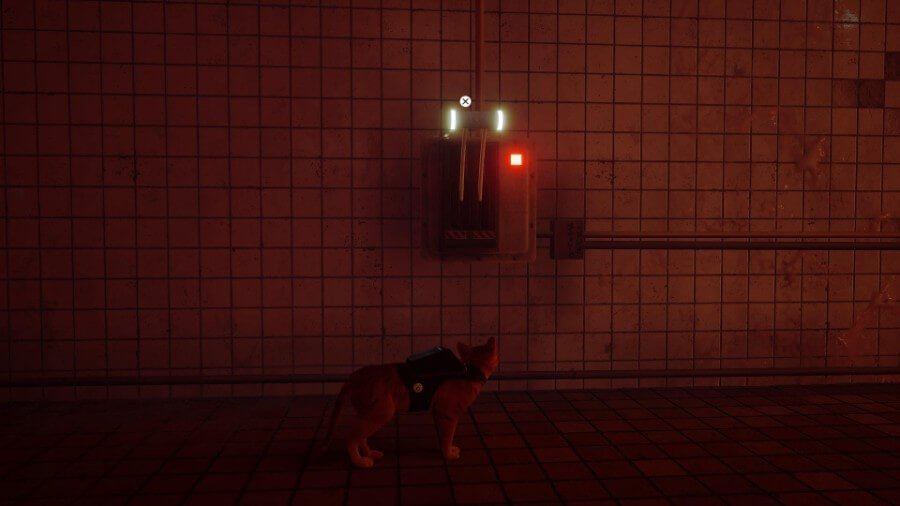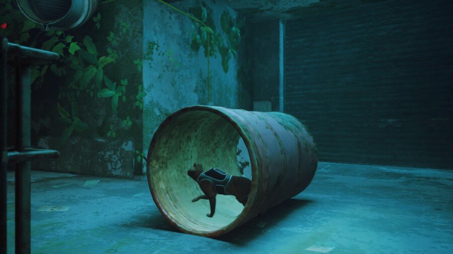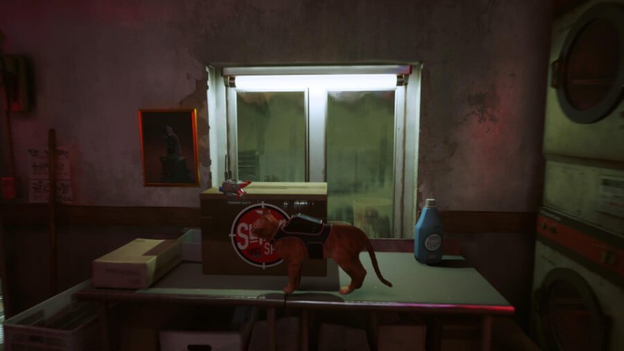 세탁실을 열려면 위의 옥상으로 가십시오(올라가려면 반대편에 있는 에어컨을 사용하십시오). 지붕을 가로질러 페인트 통을 던지는 로봇 두 대가 보일 것입니다. 상호 작용한 다음 메시지가 표시되면 서클을 눌러 야옹합니다. 이것은 그들 중 하나에게 충격을 주어 페인트 캔을 떨어뜨릴 것입니다. 세탁소 주인은 화를 내며 로봇에게 소리를 지르며 나갈 것입니다. 적어도 지금은 들어갈 수 있습니다!