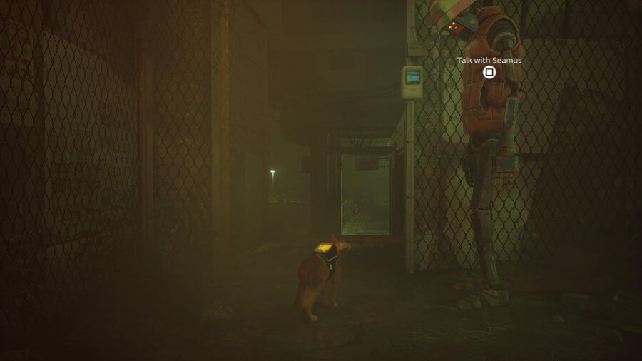 시무스에게 돌아가십시오. 그는 고정된 추적기에 감탄한 다음 아버지를 추적하는 데 사용할 것입니다. 그가 불 옆에서 잡담을 하고 있는 두 로봇 너머에 있는 명백한 입구 문으로 끝날 때 그를 따라가십시오. 그는 문을 열고 당신을 따라갈 것입니다.