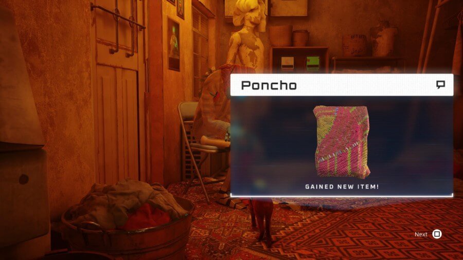 물물교환 로봇으로 가서 케이블용 세제를 교환하세요. 할머니(빈민가 반대편)에게 가서 케이블을 주세요. 껍데기 판초를 짜다! 판초를 손에 들고 엘리엇의 아파트로 돌아갑니다.