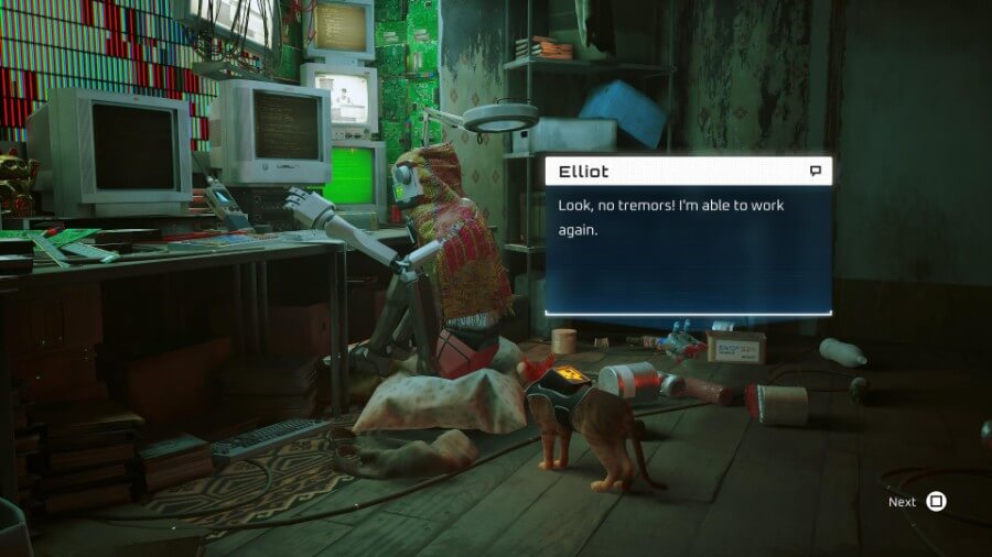 Elliot에게 판초를 선물하면 즉시 떨림이 치료될 것입니다. 그러면 그는 당신을 위해 추적기를 고칠 것입니다. 이제 추적기가 Seamus의 위치가 아닌 Doc의 위치를 찾을 수 있습니다. 즉, 빈민가 너머로 향할 길이 있습니다.