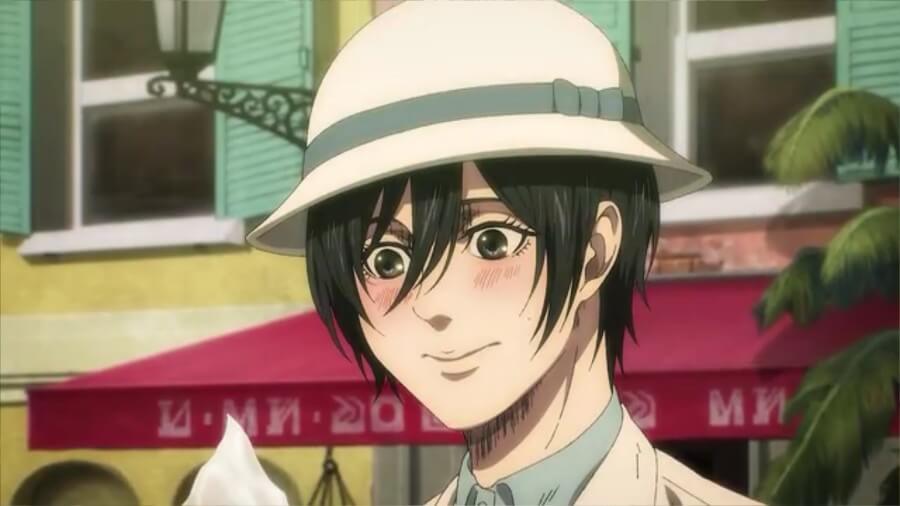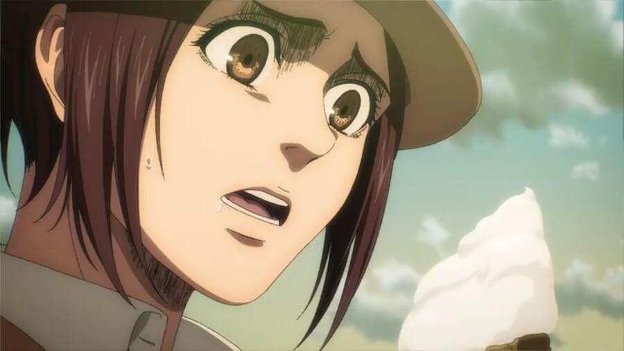 미카사는 원뿔을 에렌에게 가져오려고 합니다. 그는 “노인의 추억”(Grisha’s)에서 아이스크림에 대해 알고 있을 뿐이며 수용 구역에 있는 Eldians는 아이스크림을 먹을 기회가 거의 없었다고 말합니다. 미카사는 실시간으로 에렌의 변화를 눈치채지 못했다거나 눈치채지 못했다고 말한다.