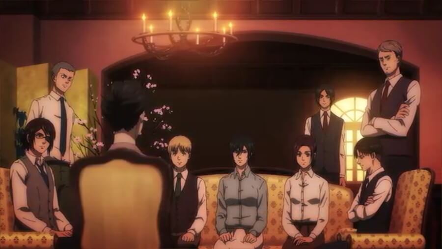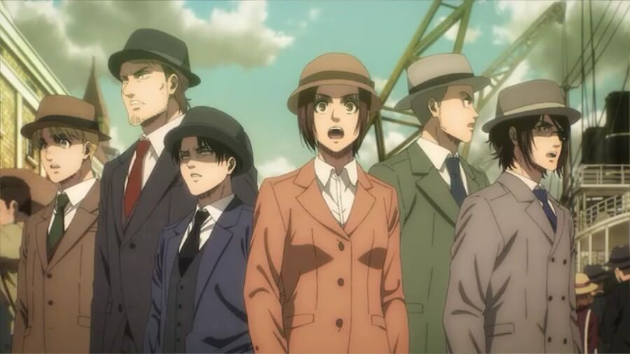 Connie, Jean, Sasha가 배의 갑판에 있었고 벽 너머의 세계에 놀랐을 때 플래시백이 표시됩니다. 진은 코니에게 벽에 대해 너무 시끄럽게 이야기하지 말라고 하지만 사샤는 진의 억울함에 자신의 정체를 자랑스럽게 선언합니다. 리바이와 아르민이 측량을 시작하라고 말하는 행이 옆에 표시됩니다. 그들은 모두 타이틀 화면이 표시되는 것처럼 호화로운 라이너로 보이는 것에 어울리는 옷을 입고 있습니다.