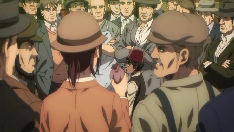 그들은 한 남자가 전 세계에 있는 이미르의 신민들을 위한 도움을 요청하는 집회로 이어집니다. 그는 그들이 Eldian 제국의 “치명적인 이데올로기”와 관련이 없으며 그들의 증오는 Paradis Island를 향해야 한다고 주장합니다. 그는 ‘섬의 악마’를 진정한 적으로 부르며 관중들의 뜨거운 박수를 받고 있다.