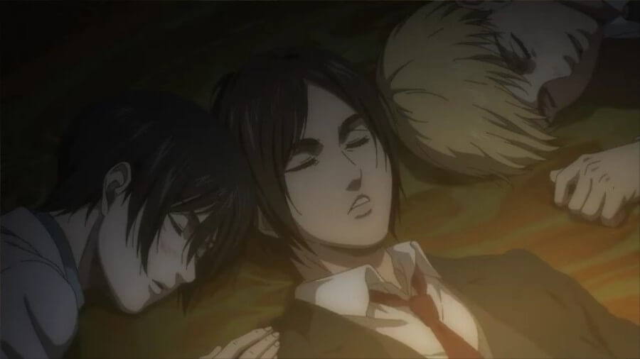 미카사는 다른 쪽을 바라보고 있던 에렌과 함께 있습니다. Armin은 Eren에게 접근하여 “외부 세계”에 있는 것처럼 함께 하라고 말합니다. 에렌은 여기가 바다 건너편이라고 의아하게 말합니다.