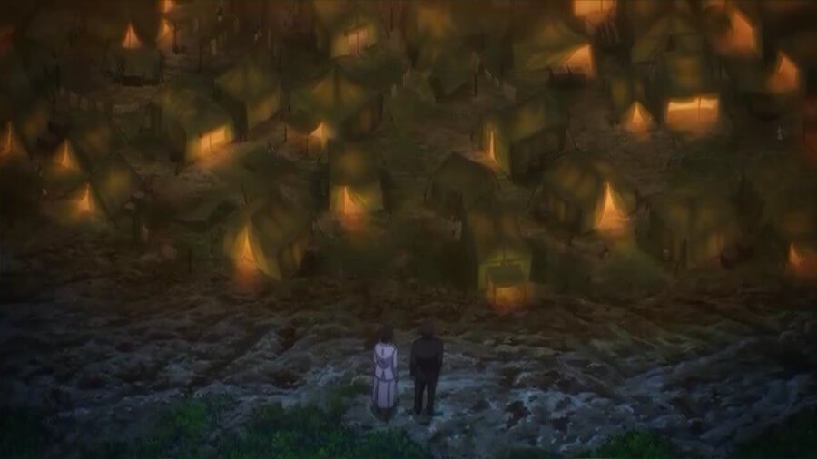 갑자기 미카사는 에렌이 사라진 것을 깨닫습니다. Eren은 밤에 언덕 꼭대기에 서서 이전 소년이 가족에게 달려가는 것을 지켜보고 있습니다. 미카사는 적의 표적이 된 그를 꾸짖기 위해 다가가다가 눈에서 눈물을 닦는 미카사를 발견한다. 그들은 전쟁으로 생을 마감한 사람들이 생존을 위해 모인 거대한 난민 수용소가 무엇인지 내려다보고 있습니다. 에렌은 이 사람들이 자유를 박탈당하고 있다고 말합니다.