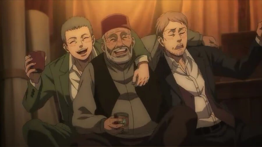 그는 Eren에게 약간의 보드카(아마도)를 따르고 Eren은 그것을 한 번에 마신다. 다른 사람들은 Eren의 모범을 따라 술을 마셨습니다. 유쾌하고 술 취한 잔치 연극의 장면. 술이 떨어지면 진영 전체가 함께 모여 그들이 직면한 억압의 바다에서 하나의 큰 행복한 잔치를 벌인다. Levi, Hange, Onyankopon은 한밤중에 나머지 일행을 찾아와 모두가 의식을 잃었고 뒤에 있는 한 사람도 구토를 하는 것을 목격했습니다!