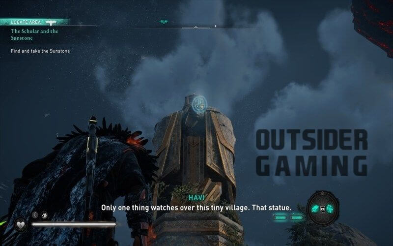 마을에서 정착지가 내려다보이는 거대한 드워프 동상을 찾아야 합니다. 지금까지 Havi에게 주어진 단서는 Sunstone이 거대한 동상에 있음을 암시합니다. 위로 올라가 Sunstone이 여기에 없다는 것을 발견하고 다시 내려가 Odin’s Sight를 사용하여 동상이 직면한 집에서 다음 목표를 찾으십시오.