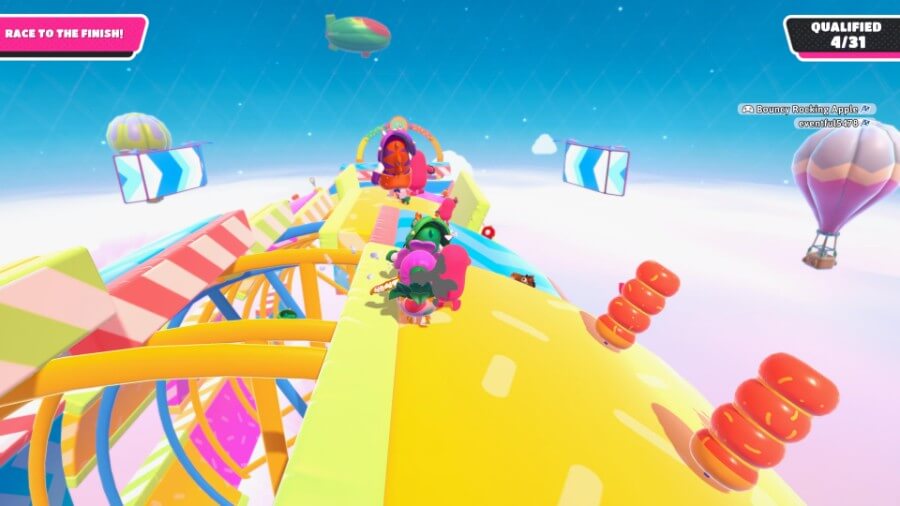 시작할 때 최대 60명의 플레이어가 있습니다. 경쟁자가 줄어들더라도 이 스테이지에는 많은 플레이어를 수용할 공간이 많지 않다는 것을 빨리 알게 될 것입니다. 레벨이 끝날 때까지 필연적으로 다른 플레이어와 마주치게 됩니다. 다른 플레이어를 때리면 추진력이 저하되고 위치에 따라 무대에서 탈락할 수도 있습니다.