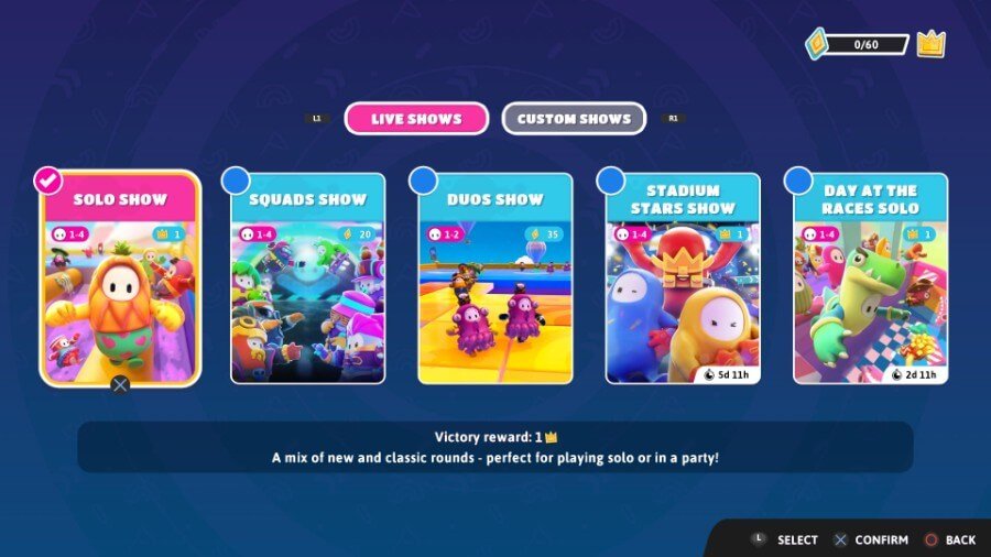 Fall Guys에는 현재 5가지 플레이 모드가 있습니다. 솔로 쇼, 스쿼드 쇼, 듀오 쇼, 스타디움 스타 쇼 및 레이스 솔로의 날. 후자의 2개는 시간 제한이 있습니다. 많은 사람들이 솔로 플레이를 선호할 수 있지만 다른 게임보다 싱글 또는 멀티플레이어를 우선시함으로써 게임은 다른 게임처럼 어려움을 겪지 않습니다.