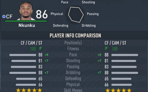 Nkunku는 또한 최대 5성 스킬 동작 등급과 높은 공격 작업률을 가지고 있습니다. 그의 최고 속성은 90 밸런스, 89 드리블, 89 스프린트 속도, 88 페이스, 88 민첩성 및 88 볼 컨트롤입니다.