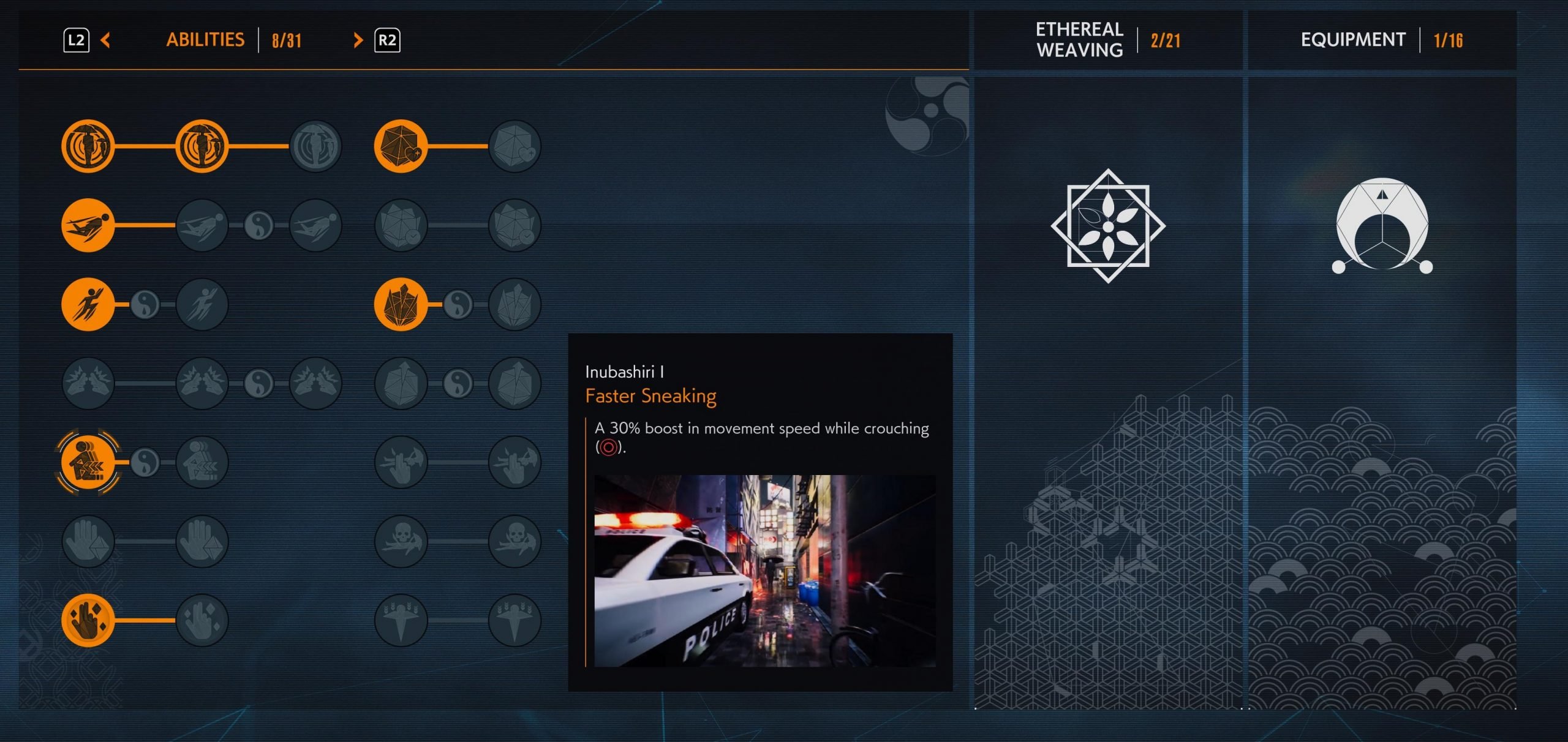 이누바시리를 사용하면 은신 속도를 크게 높일 수 있습니다. 좋은 소식은 증가된 속도는 발소리를 증가시키지 않습니다! 소리는 여전히 작게 들리므로 적 뒤로 몰래 들어갈 수 있습니다. 일부 마가타마를 잡을 때까지 첫 번째 업그레이드만 할 수 있지만 그 30% 증가는 많습니다(두 번째 부스트는 60% 증가입니다).