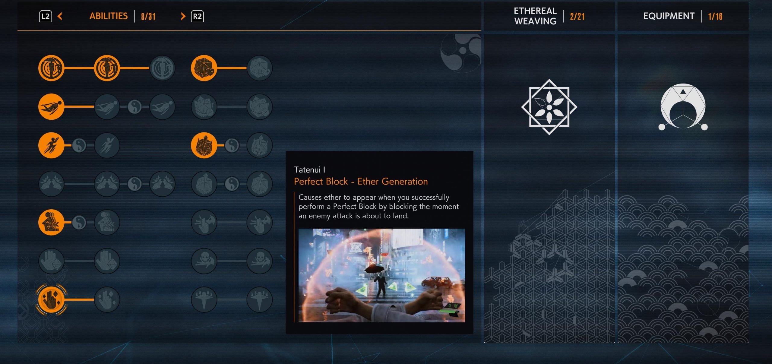 주황색 가드 서클 주위에 노란색 오라가 번쩍이면 완벽한 차단에 도달했음을 알 수 있습니다. 타테누이와 함께 퍼펙트 블록을 착지하면 당신이 소비할 녹색 에테르를 생성하십시오. 에테르 막대가 가득 찰 때까지 스팸 메일을 보낼 수 있습니다. 운 좋게도 두 번째 업그레이드는 Perfect Blocks에서 더 많은 에테르를 생성합니다. 업그레이드하는 데 마가타마가 필요하지 않습니다!