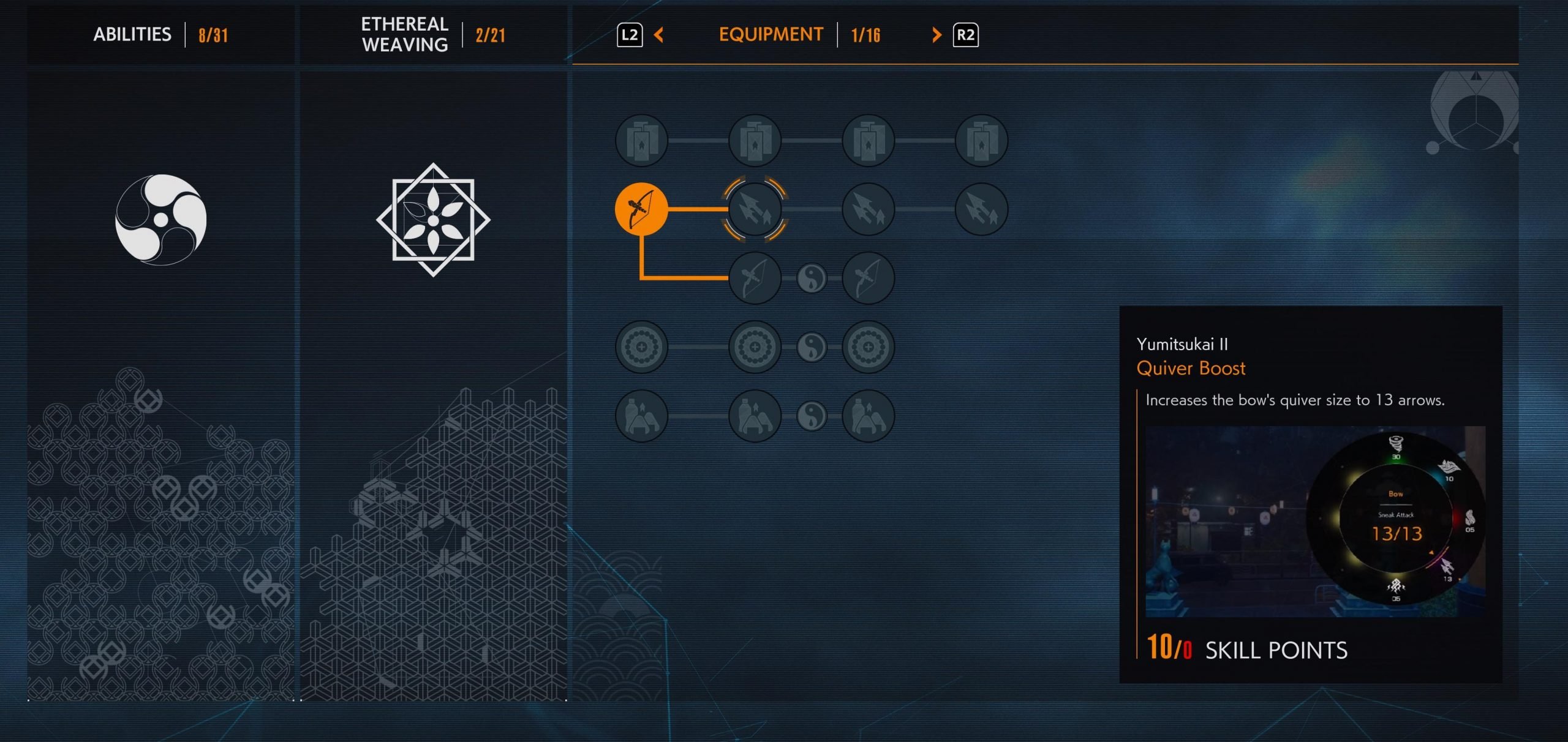 세 가지 업그레이드 각각은 몇 개의 화살표만큼 용량을 증가시킵니다. 활의 드로우 속도를 처리하는 하위 분기도 있지만 완료하려면 마가타마가 필요합니다.