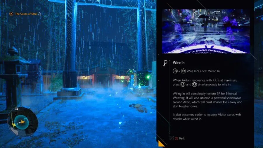 Akito의 시체와 전투 후 KK와 Akito의 시체를 재결합한 후 잠금 해제된 이것은 게임 플레이 중에 배우는 가장 강력한 기술일 수 있습니다. 당신의 공명이 가득 차고, 와이어 인을 펼칠 수 있습니다. L3와 R3을 함께 눌러 (왼쪽 및 오른쪽 아날로그 스틱을 아래로 누르십시오). 공명이 고갈될 때까지 “Wired In” 상태를 유지합니다.