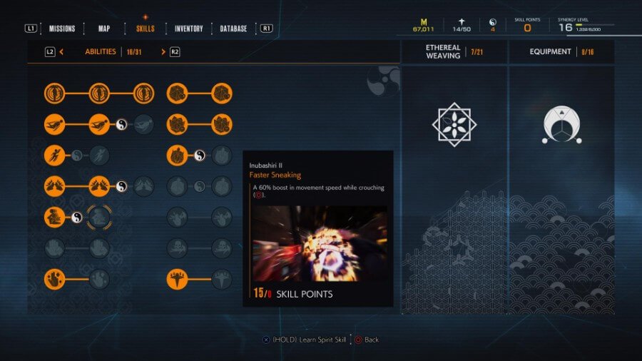 Fudo가 가장 먼저 목표로 삼는 기술 중 하나라면 Inubashiri는 당신이 업그레이드하는 첫 번째 기술. 첫 번째 업그레이드는 은신 속도를 30% 증가시킵니다. 3개의 마가타마를 적용한 후 마지막 업그레이드를 구매할 수 있습니다. 은신 속도 60% 증가.