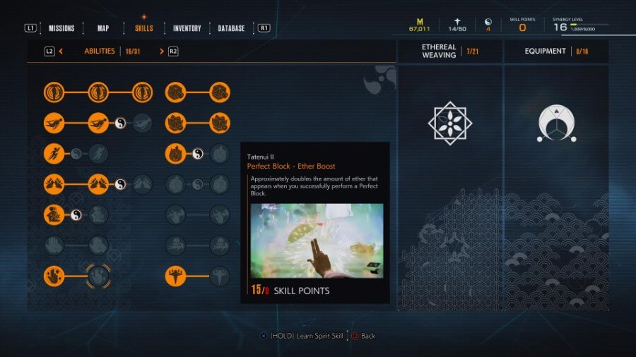 Tatenui는 에테르가 필요하고 처리할 방문자가 한두 명뿐일 때 유용합니다. 그것 Perfect Block 후 ether 생성. 퍼펙트 블록을 맞추려면 공격이 착지하기 직전에 L1을 누르십시오. 원거리 공격보다 근접 공격으로 타이밍을 잡는 것이 훨씬 쉽습니다. 이것은 일반적으로 바람 및 물 직조를 위해 Ethereal Weaving 에테르 스톡을 다시 채우기 위해 쉽게 스팸될 수 있습니다.