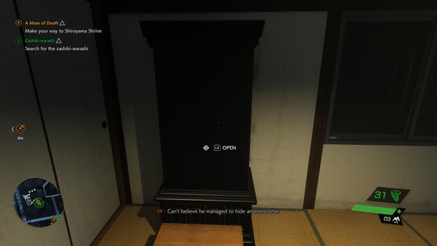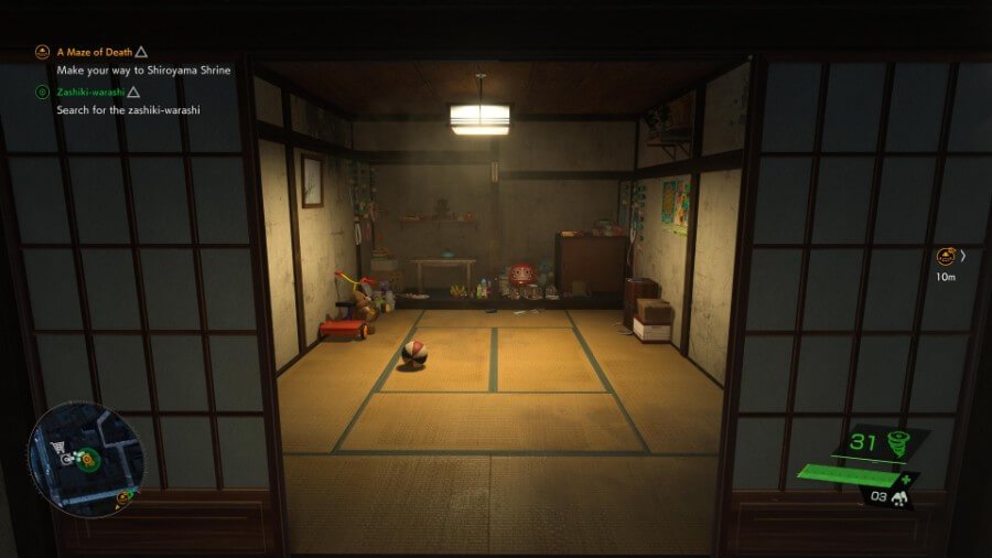 메인 미션에 가까워지면 “죽음의 미로”에서 조금 떨어진 사이드 미션의 녹색 점이 보입니다. 여기로 가서 집 밖에 있는 노부인의 영혼과 대화하십시오. 기본적으로 그녀는 욕심 많은 집주인과 문제가 있었고 집주인이 Zashiki-Warashi를 납치하는 것으로 절정에 달했습니다. 당신은 Zashiki-Warashi의 위치를 찾고 그녀를 영혼으로 돌려보내는 임무를 받았습니다.