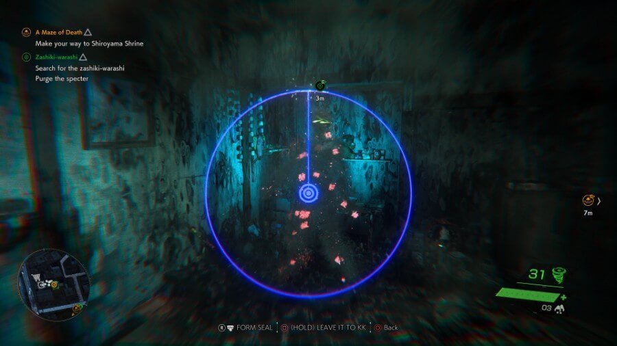 KK는 조심하기 위해 들어갈 때 경고합니다. 집주인의 악의가 발현되는 방으로 들어가 자시키-와라시가 그들의 것이라고 외치십시오. 그런 다음 손으로 봉인하라는 메시지가 표시됩니다(그림 참조). 오른쪽 아날로그 스틱을 사용하여 봉인을 만든 다음 L2와 R2를 함께 잡고 영혼을 봉인합니다.