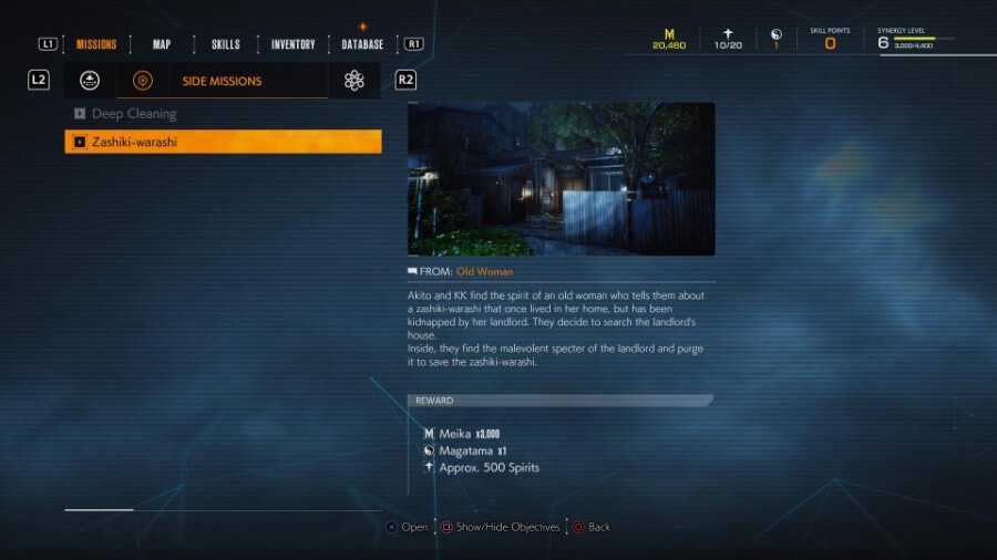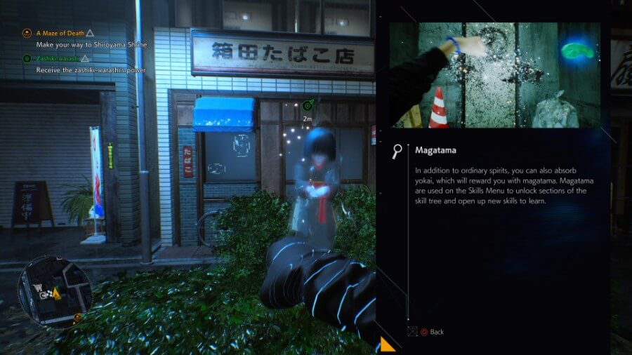 그런 다음 파란색 그릇에 제물을 올려 놓아 자시키와라시를 드러냅니다. 그것에 대해 이야기하고 외부의 영혼으로 돌아가십시오. 그녀에게 말을 걸면 요괴에 대한 정보를 조금 더 알려줄 것입니다. 그러면 영혼은 더 이상 묶이지 않고 비행기를 떠날 것입니다. 요괴가 표시되면 L2를 길게 누릅니다. 일부 기술을 향상시키는 데 필요한 마가타마를 얻습니다.. 아마도 이것은 당신이 얻는 Magatama의 첫 번째 비트가 될 것이며 그림 자습서를 트리거합니다. Zashiki-Warashi의 캐릭터 항목도 잠금 해제됩니다.