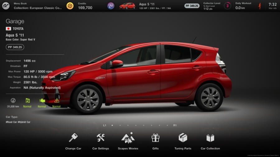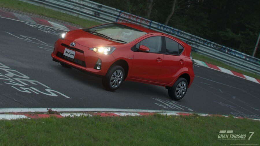 Scrapes Movies를 누르면 선택한 자동차의 작동 장면이 재생됩니다. 장면은 이상적인 순간에 슬로우 모션으로 전환되어 뉘르부르크링에서 위의 Aqua S와 같은 사진을 캡처할 수 있습니다. Scrapes Movies에서는 게임을 일시 중지하지 않으므로 공유 버튼을 통해 자유롭게 스크린샷을 캡처할 수 있습니다.