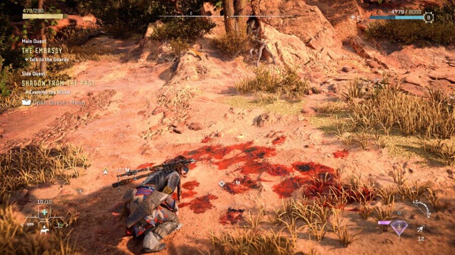 지도에 표시된 위치로 이동합니다. 집중을 사용하여 추가 조사가 필요한 몇 가지 사항이 있는지 확인하십시오. 먼저, Aloy가 죽은 경비병에게서 나온 것으로 추정되는 땅에 묻은 피를 조사하십시오.