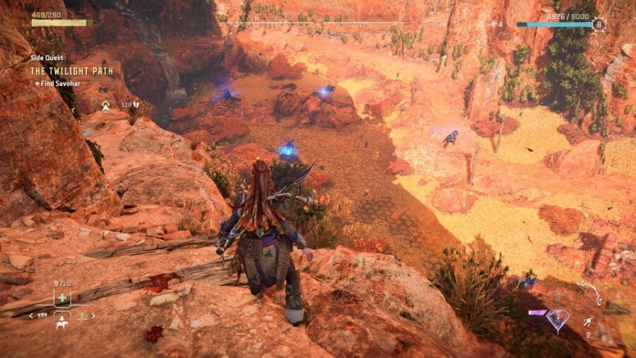 길과 산을 따라 진행합니다. 계곡에서 기계를 만날 수 있으므로 키 큰 풀을 사용하여 기계를 죽이거나(권장) 몰래 지나가십시오. 사보하르의 여정에 대한 더 많은 통찰력을 얻으려면 사다리와 같은 작은 느낌표를 모두 확인하십시오. 예를 들어 위 사진의 길에 있는 핏자국을 살펴보면 계곡으로 이어진다.
