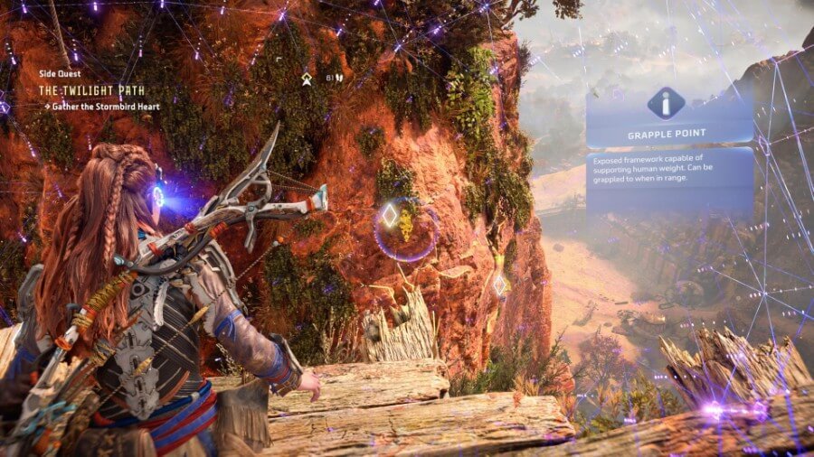 초점을 사용하여 난간을 가로지르는 그래플 포인트를 표시합니다. 이렇게 하면 절벽의 측면과 Stormbird까지 확장할 수 있습니다. 그러나 Stormbird 심장을 잡기 전에 시그널 렌즈를 꼭 잡아 옆으로.