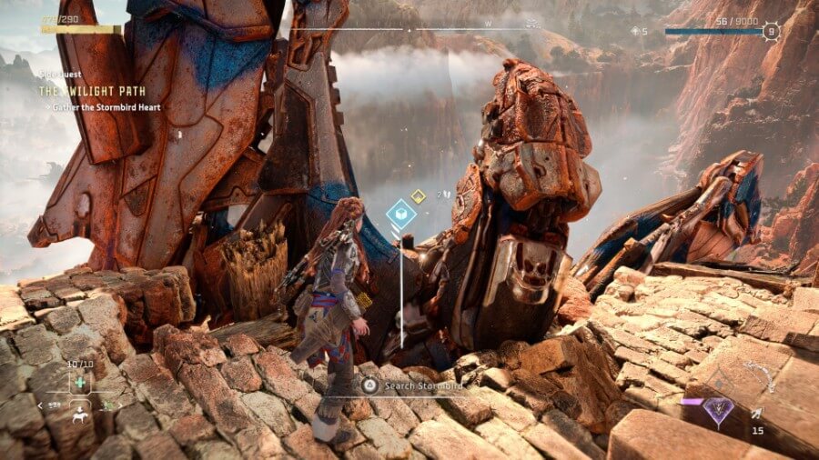 통과하고 적을 물리치거나 몰래 지나치면 결국 Savohar에 도달하게 됩니다. 그는 등반 중 폐에 구멍이 뚫리는 부상을 입고 건강이 좋지 않습니다. Aloy는 의료 서비스가 필요하다고 말하지만 시력을 받을 때까지 거부합니다. Aloy는 Stormbird 심장이 그들에게 귀중하다는 것을 알고, 그래서 그녀는 추락한 기계에서 심장을 회수하러 갑니다.