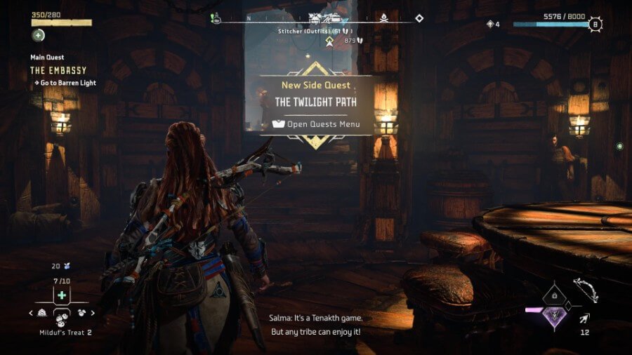 이 보조 퀘스트를 얻으려면 불모의 빛의 선술집에 있는 페트라와 대화해야 합니다. 브리슬백을 클리어하고 Studios Vuadis에게 말을 걸면 그에게 방법은 분명합니다. Aloy는 이제 Petra와 함께 그 음료를 마실 수 있다고 언급할 것이므로 머리 위에 녹색 느낌표가 있는 그녀를 찾으러 가십시오.