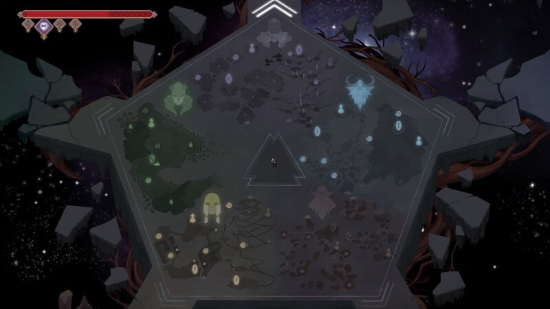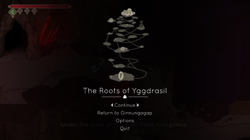Jotun은 세계를 매핑하는 독특한 방법을 가지고 있습니다. 대부분의 게임은 화면에 미니맵을 표시하거나 일시 중지 메뉴에 최소한 지도 옵션을 표시하는 옵션을 제공합니다. Jotun은 게임을 탐색하는 데 도움이 되는 독특한 방식을 가지고 있습니다. Jotun의 지도는 게임의 허브 역할을 합니다.. 일시 중지 메뉴에서 “긴눈가갑으로 돌아가기”를 선택하면 언제든지 여기로 돌아갈 수 있습니다.