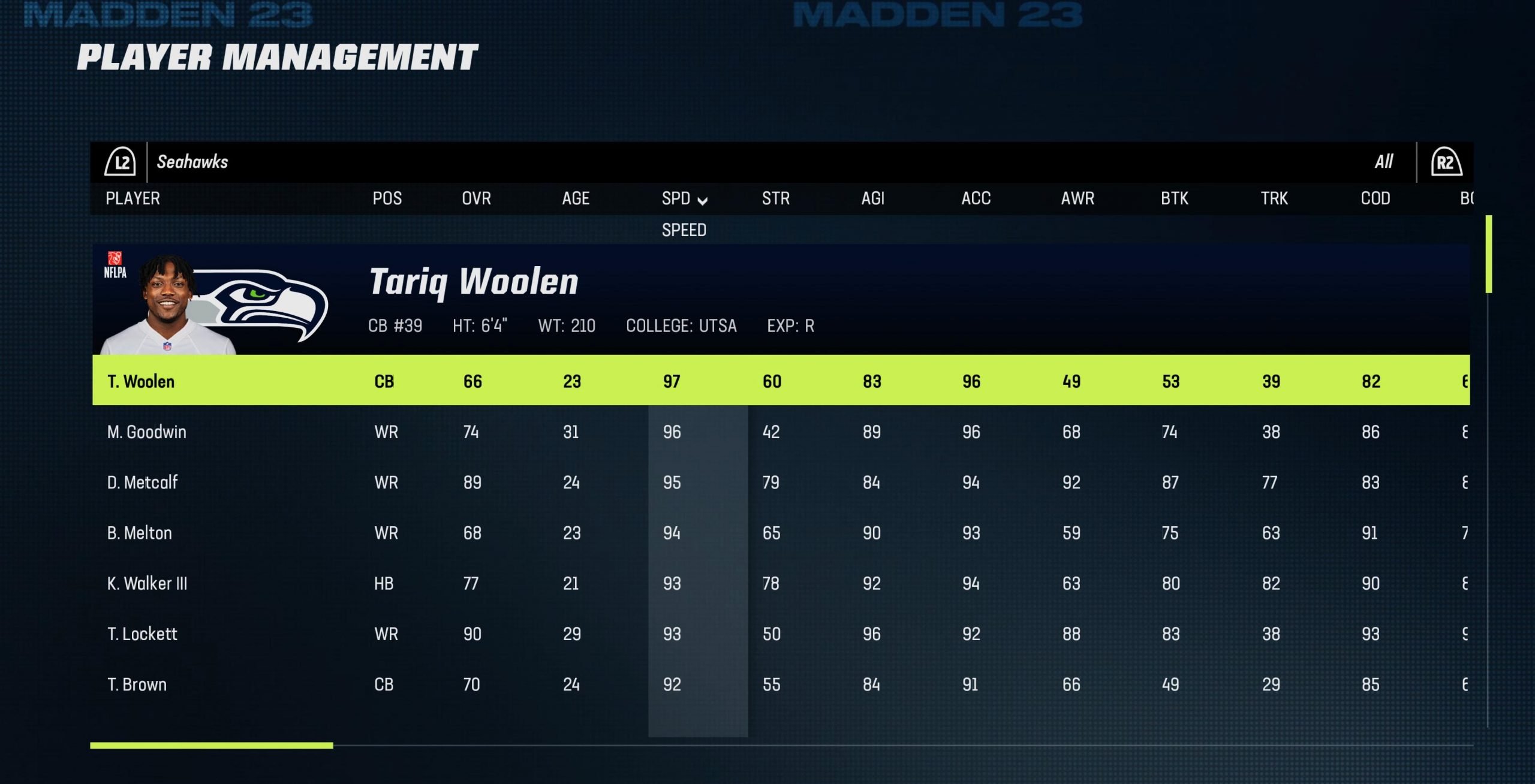 가장 빠른 선수: Tariq Woolen, CB (97 속도); 후작 Goodwin, WR (96 속도); DK Metcalf, WR(95 속도); 보 멜튼, WR(94단)