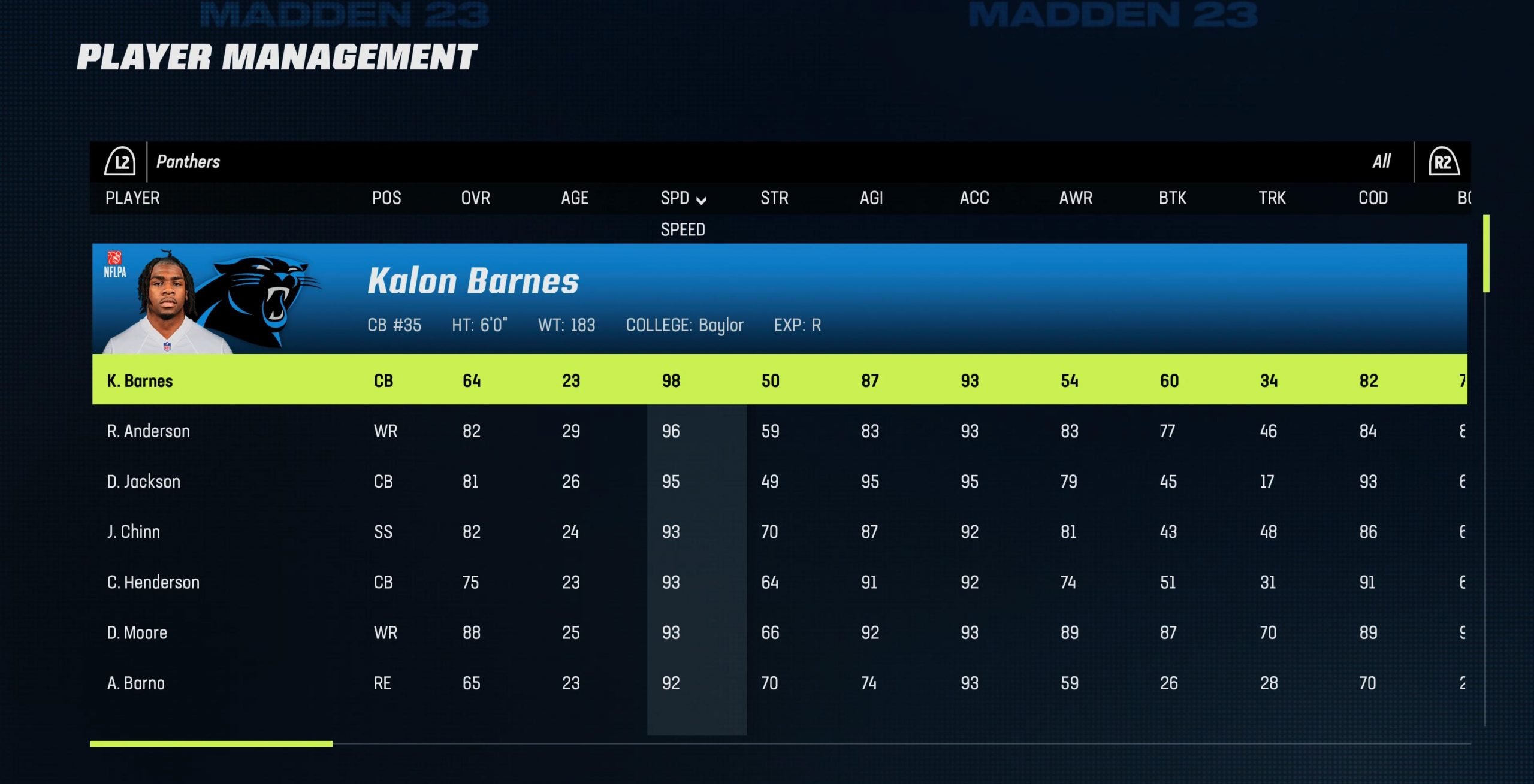 Carolina는 두 가지 주요 영역에서 빠른 팀입니다. 보조 및 광역 수신기. Kalon Barns(98 속도)는 Jeremy Chinn(93 속도), CJ Henderson(93 속도), Jaycee Horn을 포함하는 수비 수비 그룹 그룹을 리드(속도 측면에서)하고 Donte Jackson(95 속도)이 플레이해야 합니다(64 OVR). (92 속도), Myles Harfield(92 속도)는 공과 의도된 목표물에 접근하는 데 도움이 됩니다.