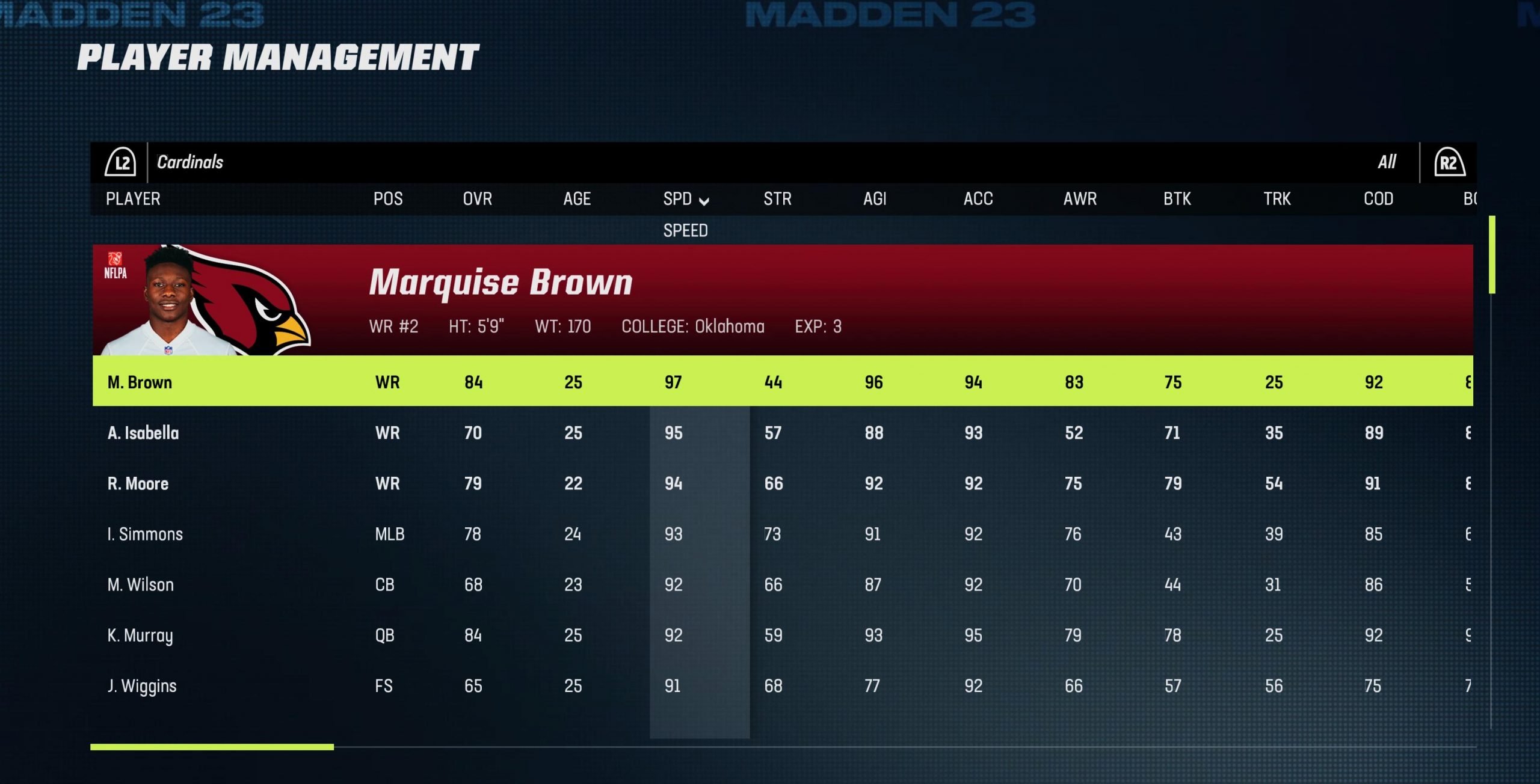 가장 빠른 선수: Marquise Brown, WR(97 속도); Andy Isabella, WR(95 속도); 론데일 무어, WR(94단)