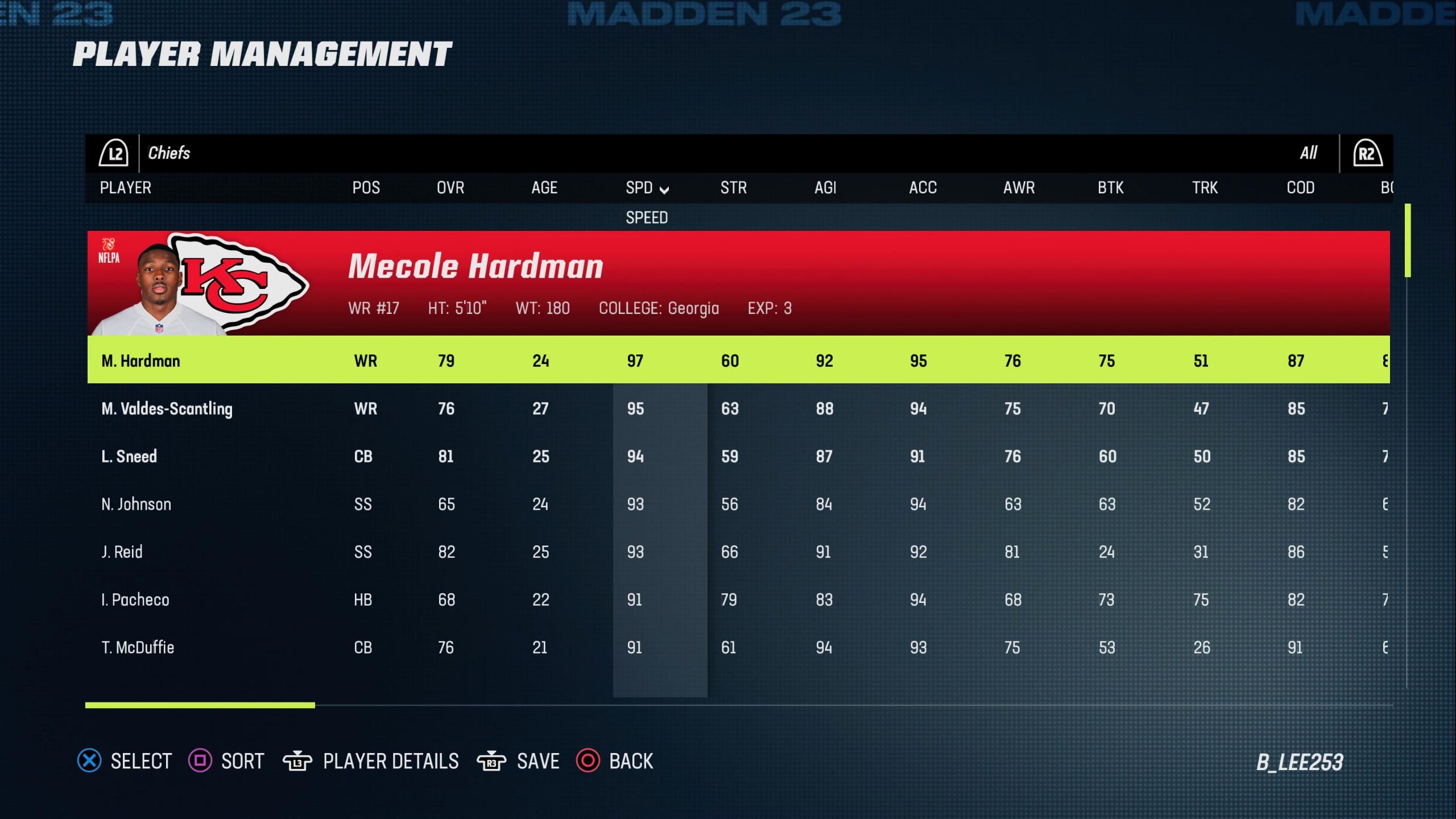 수비적으로 두 번째는 L’Jarius Snead(94 속도), Justin Reid(93 속도), 잠재적으로 Nazeeh Johnson(93 속도, 65 OVR) 및 Trent McDuffie(91 속도, 76 OVR)로 견고합니다. Leo Chenal과 Willie Gay(둘 다 88 속도)와 Nick Bolton(87 속도)은 속도 면에서 견고한 3명의 지지자를 형성하지만 가장 빠른 수신기를 따라잡기에 충분하지 않습니다. 그럼에도 불구하고 Kansas City는 전반적인 속도 덕분에 양측 모두에게 위협이 될 것입니다.