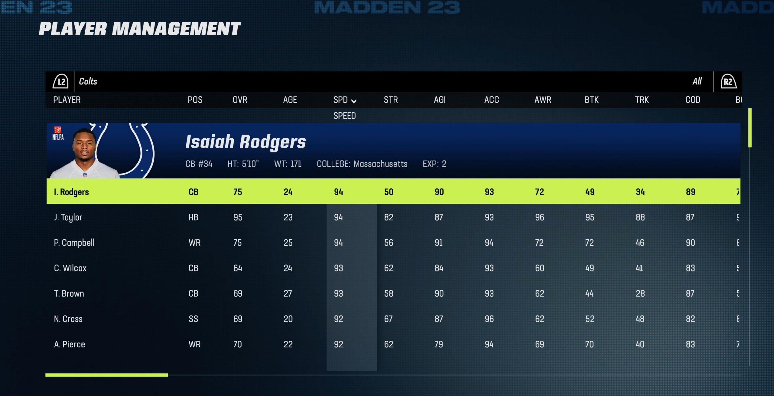 인디애나폴리스는 94타점을 가진 3명의 플레이어가 속도 면에서 선두를 달리고 있습니다. 1위는 코너백 이사야 로저스, 스테판 길모어(90스피드), 케니 무어 2세(89스피드)와 함께 든든한 수비라인을 형성하고 있다.