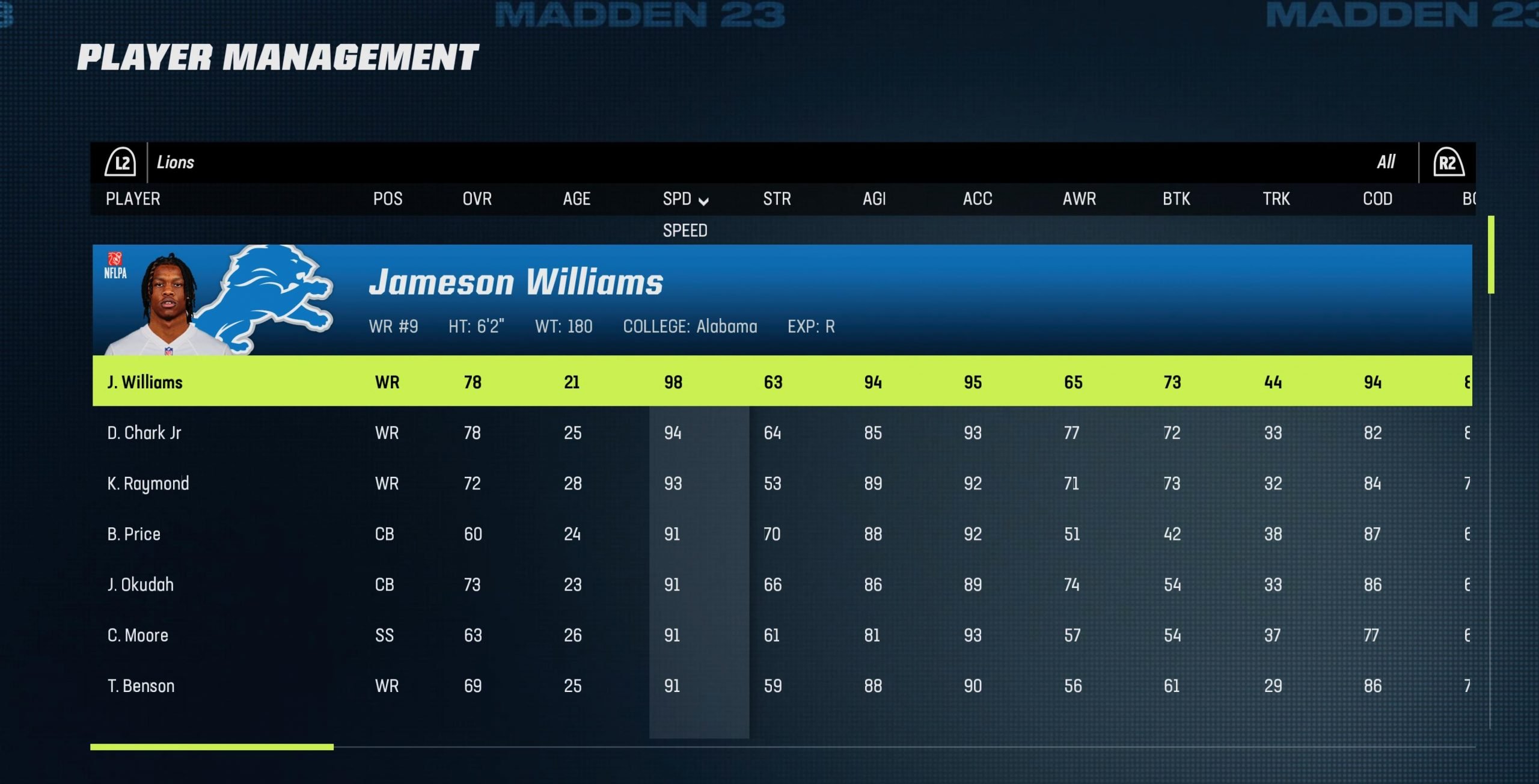 기복보다 기복이 훨씬 많은 프랜차이즈 디트로이트에는 제임슨 윌리엄스(Jameson Williams)와 DJ 차크 주니어(DJ Chark, Jr.)와 함께 선두를 달리고 있는 94스피드 리시버 2명이 있다. 바로 뒤에 칼리프 레이먼드(Kalif Raymond)(93스피드)와 트리니티 벤슨(91스피드), 수신 부대의 속도를 반올림합니다. 하프백 D’Andre Swift(90 Speed)를 시작하는 것은 백필드 밖에서도 속도를 제공합니다.