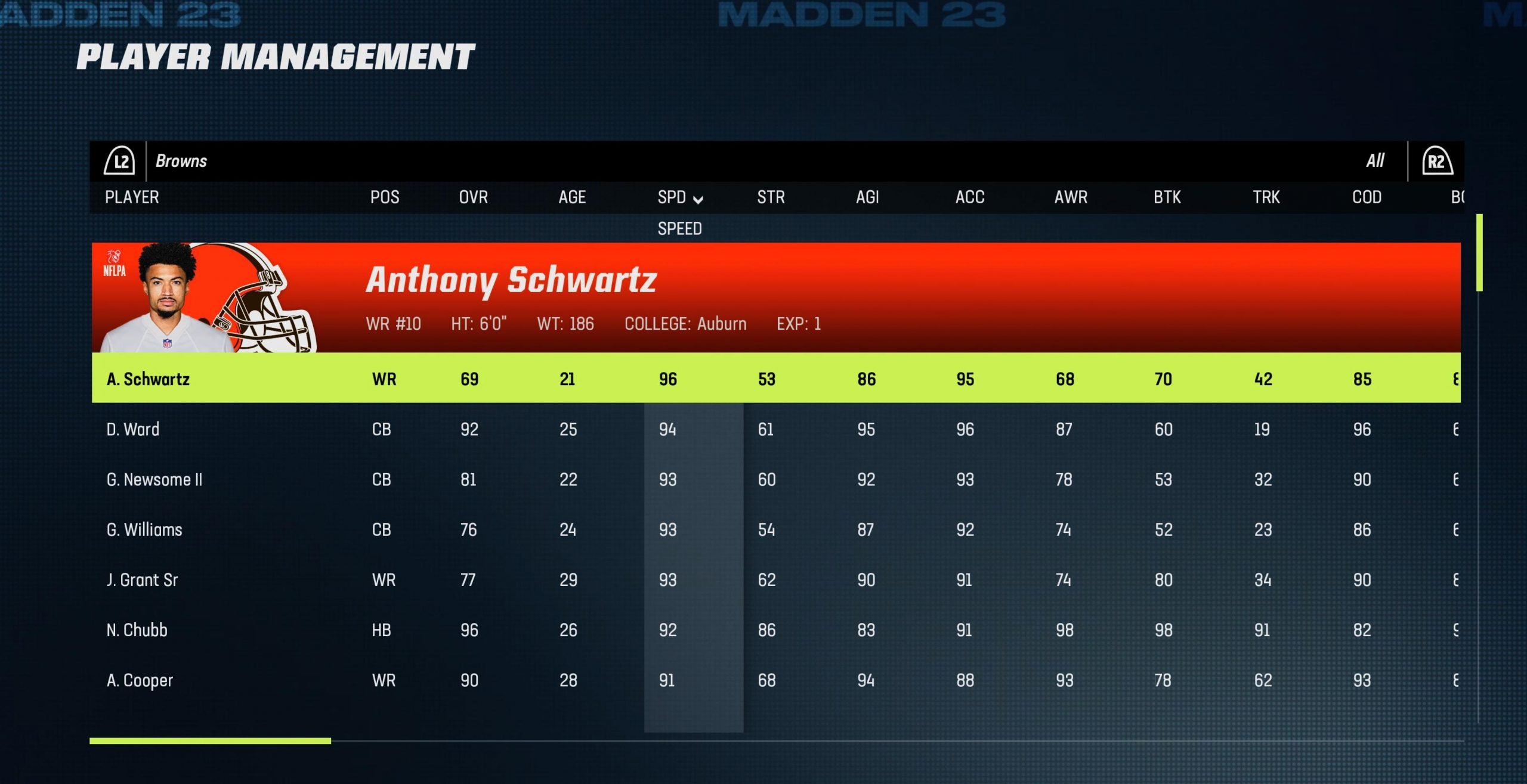 클리블랜드의 팀은 리시버와 수비적인 백 포지션에서 빠른 속도를 가지고 있습니다. Anthony Schwartz(96 속도)는 모든 다운을 플레이하지는 않지만 WR4는 WR1 Amari Cooper(91 속도), Jakeem Grant, Sr.(93 속도) 및 Donovan Peoples-Jones(90 속도)와 결합하여 수신기. 하프백 Nick Chubb는 92 스피드와 96 OVR로 파티에서 그리 멀지 않습니다.