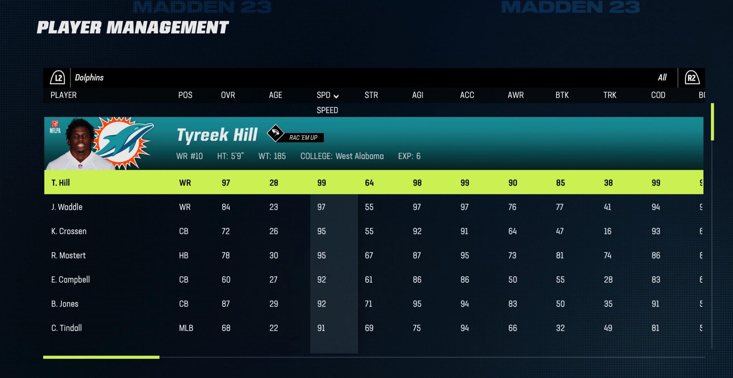 가장 빠른 선수: Tyreke Hill, WR(99 속도); Jaylen Waddle, WR(97 속도); Raheem Mostert, HB(95 속도); 케이온 크로센, CB (95 속도)