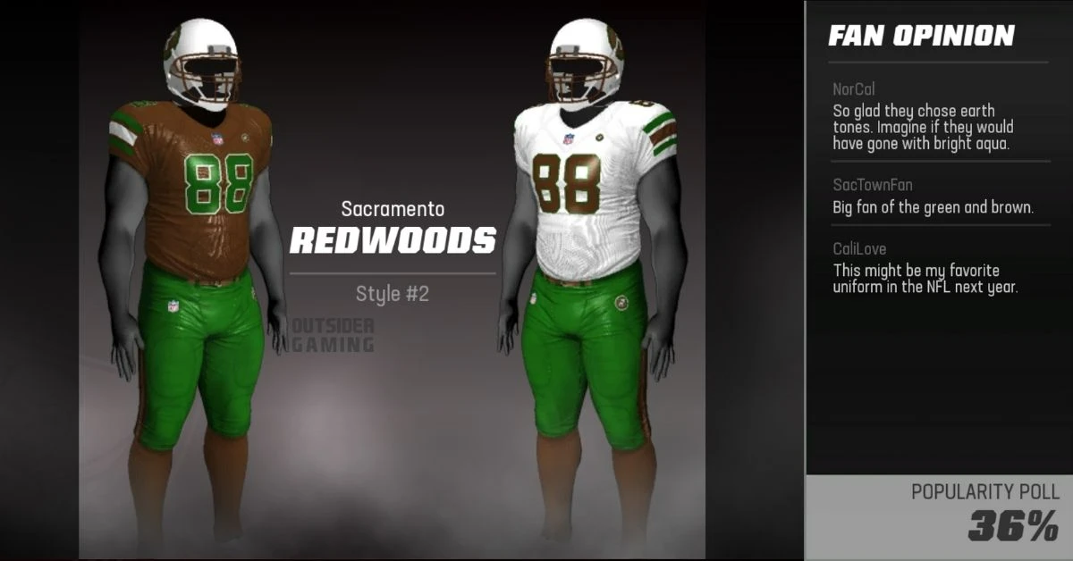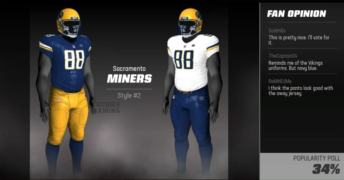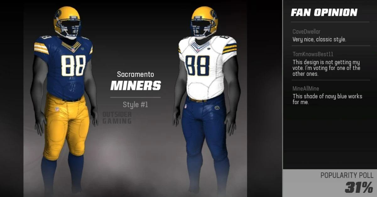 Madden 23의 Sacramento Condors, Miners 및 Redwoods에 대한 새크라멘토 재배치 유니폼, 팀 및 로고가 모두 있습니다.