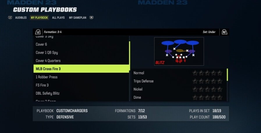 최고의 플레이: MLB 크로스 파이어 3(3-4언더), 커버 1 QB 포함(다임 2-3-6), 커버 6(니켈 2-4)