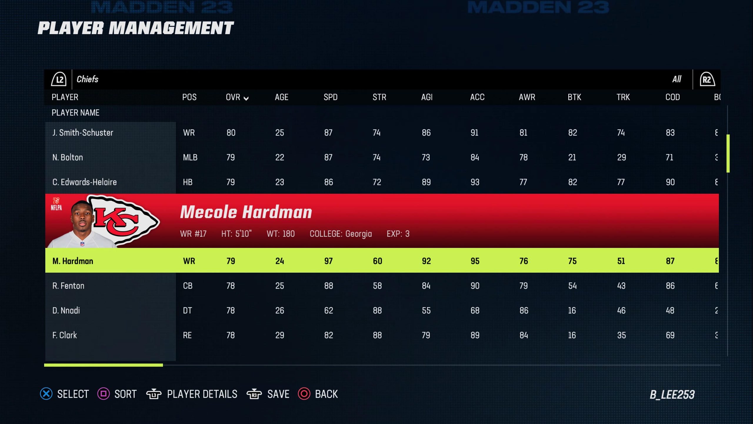 Hardman이 Madden 23에서 잠자코 있는 한 가지 주된 이유가 있습니다. Tyreke Hill이 Miami로 출발하는 것입니다. 물론 JuJu Smith-Schuster(80 OVR)는 현재 WR1으로 명단에 있지만 Hardman은 79로 전체 등급에서 바로 뒤에 있으며 3년 밖에 뛰지 않았기 때문에 더 젊습니다. 그는 속도 등급이 97이므로 Smith-Schuster보다 깊은 경로에 더 이상적이기 때문에 최고 등급의 속도 위협자이기도 합니다. 당신이 약한 팀을 통제하고 있다면 그는 즉시 상위 2개 와이드아웃 위치로 뛰어들 것이고 더 강한 팀에서 당신의 받는 군단을 강화할 수 있습니다.