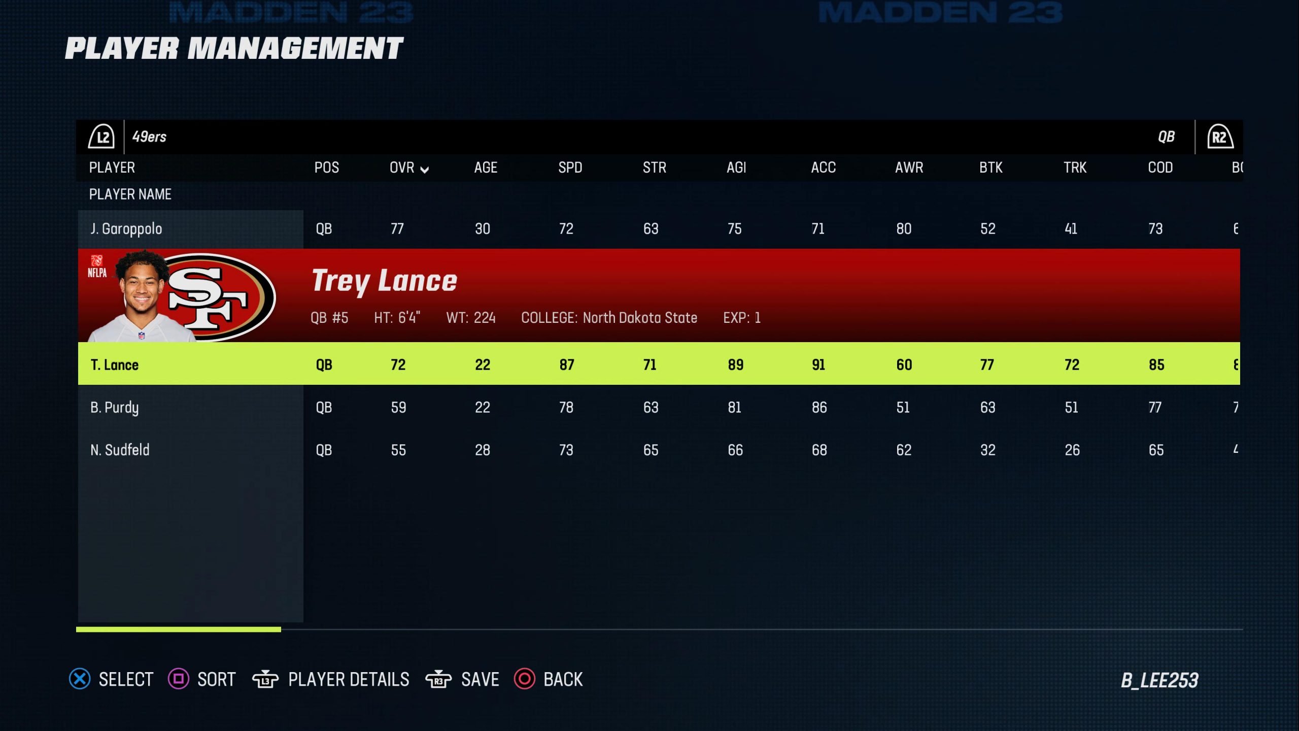 Jimmy Garoppolo(77 OVR)가 Trey Lance(72 OVR)보다 높은 평가를 받은 반면, Lance는 샌프란시스코의 2022 시즌을 향한 선발 투수로 확고히 자리 잡았습니다(Garoppolo는 가치 있는 트레이드 조각입니다). Kyle Shanahan의 공격은 Lance의 잠재력을 극대화하는 경향이 있지만 상황에 따라 두 번째 스트링거 또는 쿼터백이 될 수도 있습니다. 샌프란시스코가 슈퍼볼을 만들고 우승할 것이라고 예측하는 많은 이야기 헤드와 함께 그가 실생활에서 구축하고 있는 과대 광고가 원격으로 Madden 23으로 번역되면 그는 쉽게 올해의 신인이 될 것이며 아마도 최고의 잠자는 사람이 될 것입니다. 이 목록.